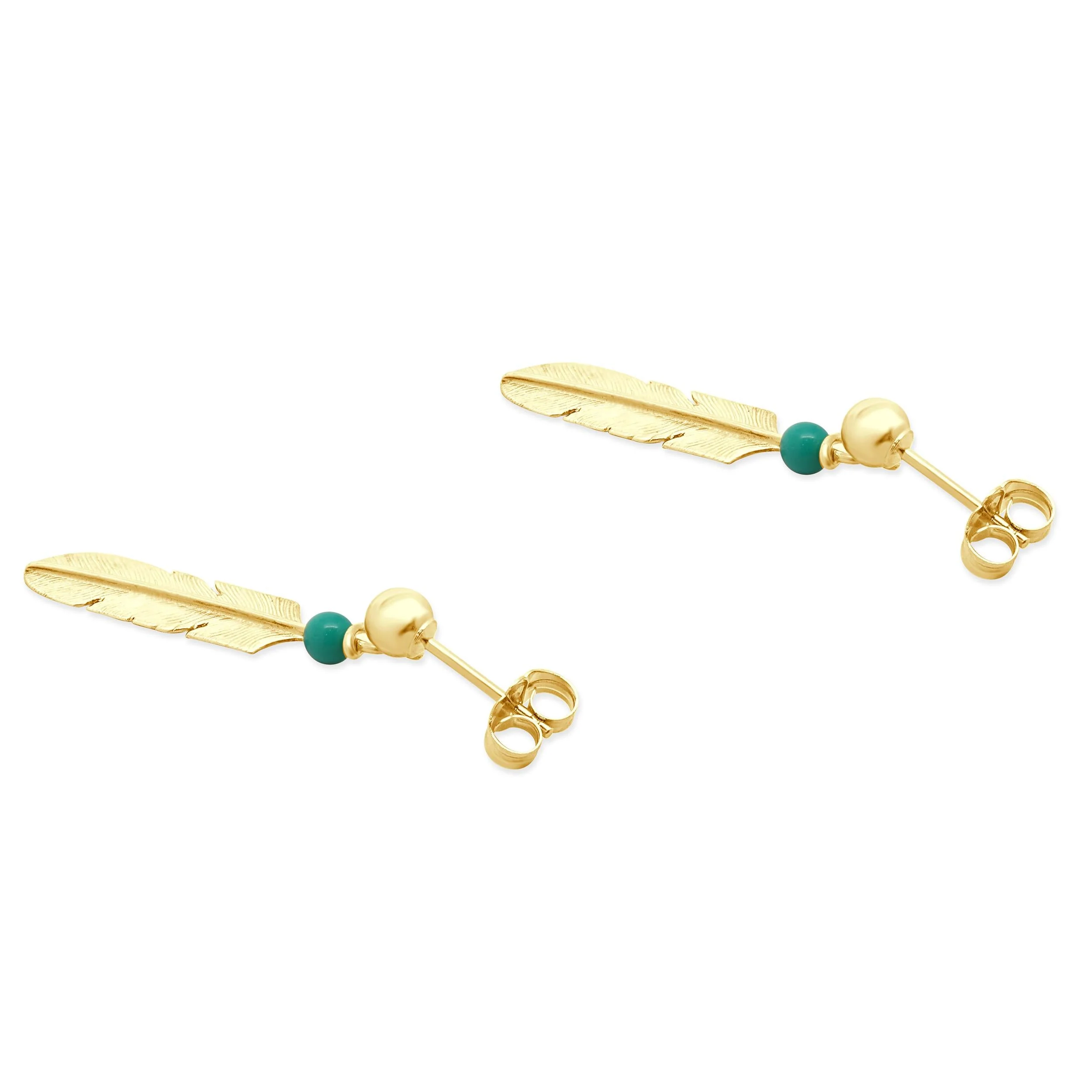 Elevate your style with the exquisite 14 Karat Yellow Gold Native American Turquoise Feather Drop Earrings. These beautifully crafted earrings feature delicate feather designs, meticulously fashioned from 14K yellow gold, measuring 29.30mm by 5.76mm. The center stone, a stunning turquoise bead, exudes a vibrant splash of color, perfectly complementing the rich golden hue. Weighing a graceful 1.45 grams, these earrings not only boast elegance but also a lightweight, comfortable fit. Each feather is intricately detailed to capture the essence of natural beauty, making them a unique and timeless addition to any jewelry collection.