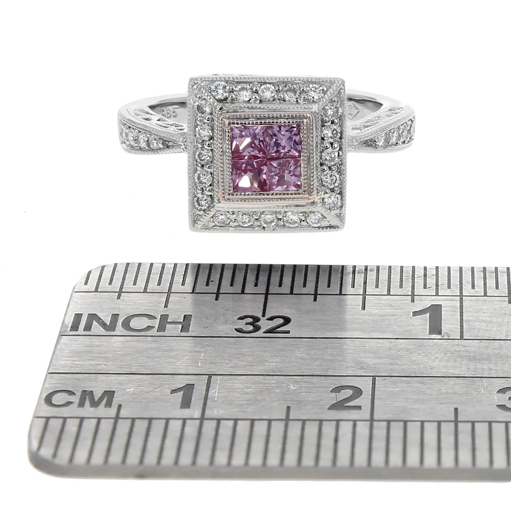 This beautifully crafted ring is set in luminous 14K white gold and features a striking square-top design finished to a high polish. At its center are four princess-cut synthetic pink sapphires, invisibly set to create a seamless field of vibrant color, totaling approximately 0.20 carats. Encircling the center design is a delicate halo of twenty-eight prong-set round brilliant diamonds, totaling approximately 0.21 carats, displaying H color and SI1 clarity for refined sparkle and brilliance.