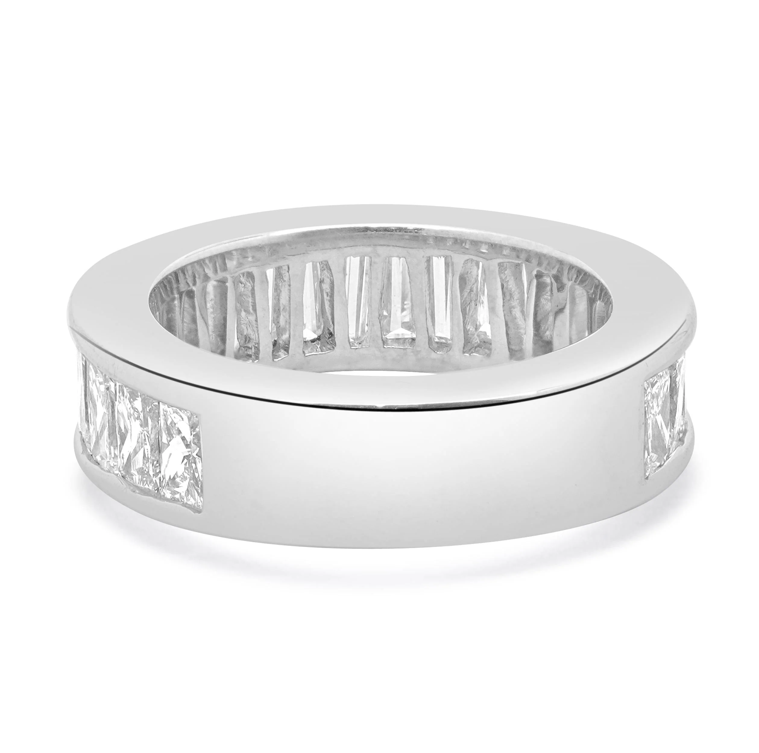 Immerse yourself in the timeless elegance of this 18 Karat White Gold Channel Set Diamond Band. Featuring 22 precisely custom-cut baguette diamonds, this stunning wedding band exudes a seamless brilliance that captivates from every angle. Meticulously channel-set into the solid white gold band, the diamonds create an unbroken stream of sparkle, with each stone carefully calibrated for a perfect fit, eliminating the need for prongs and ensuring a sleek, snag-free finish.