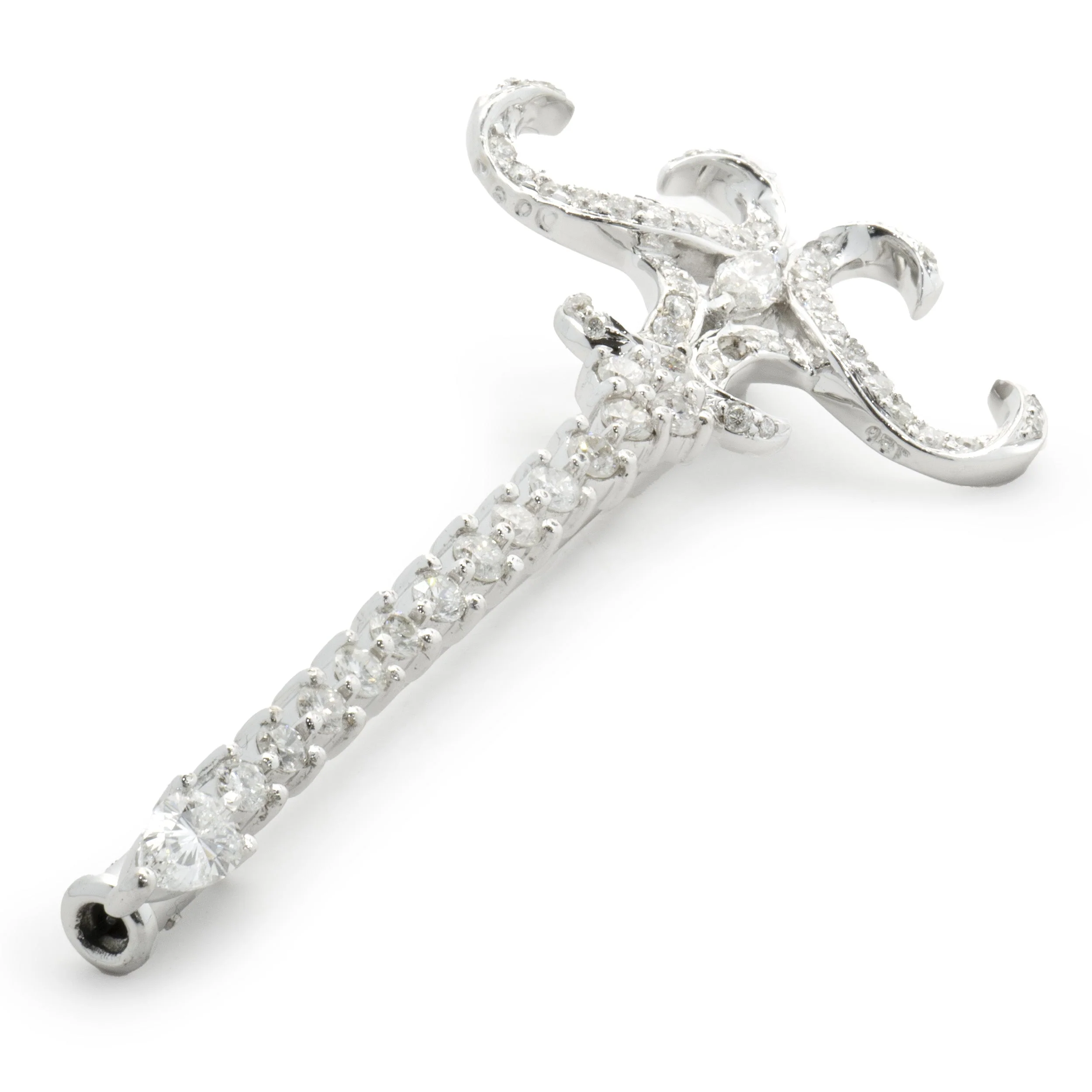 Experience the exquisite elegance of this 18 Karat White Gold Diamond Sword Pin, where timeless craftsmanship meets striking design. Expertly fashioned in solid white gold, its clean lines and refined silhouette capture a precise, architectural presence. Adorning the sword motif are 58 brilliant round diamonds, totaling 0.67 carats, with SI1-SI2 clarity and captivating G color, offering a radiant contrast to the cool-toned metal. Measuring 47mm by 22mm, and weighing 3.73 grams, this lapel-ready pin is a testament to both durability and sophistication. The polished finish enhances light reflection, accentuating the blade and hilt contours for a distinctive, sharp aesthetic suited for any discerning wearer.