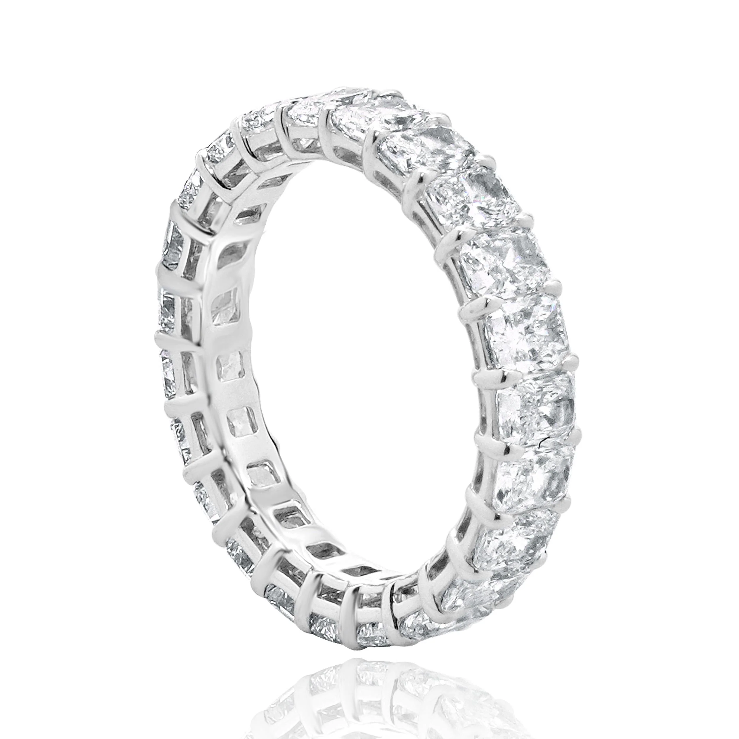 Experience unparalleled brilliance with this 18 Karat White Gold Radiant Cut Diamond Eternity Band, a masterful showcase of elegance and precision. Encircling your finger with 23 radiant-cut diamonds, totaling an impressive 4.46 carats, each stone is precisely cut to emphasize spectacular light return, delivering a scintillating display from every angle. The diamonds boast a clarity range of VS2-SI1 and a color grade of G-H, ensuring extraordinary sparkle and purity. Set in the luxurious strength of 18k white gold, known for its bright, neutral tone, this eternity band is the epitome of timeless design, perfect as either a wedding band or a stacking piece. With a meticulous arrangement emphasizing symmetry, this unsizable ring offers consistent brilliance, making it a stunning addition to any jewelry collection.