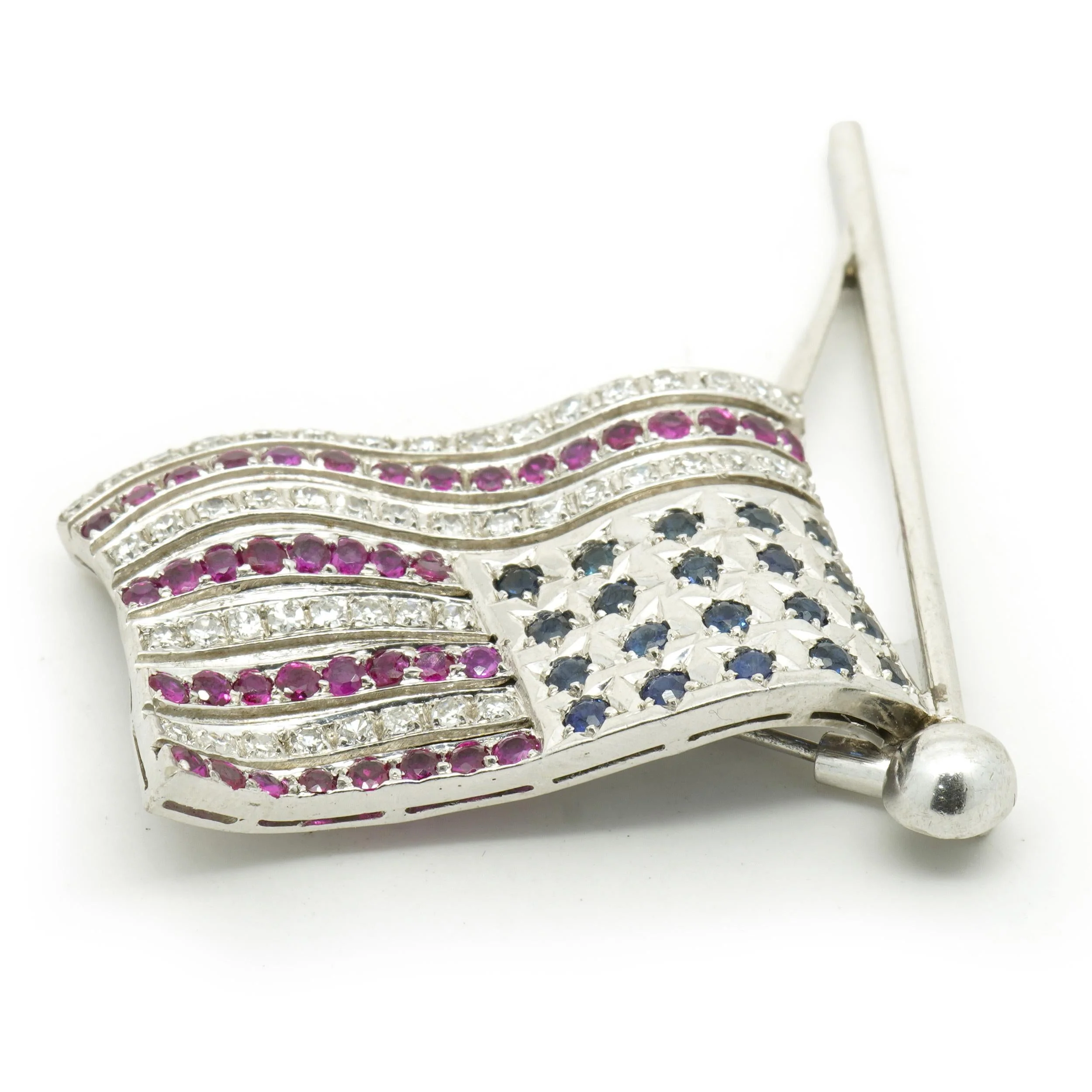 Crafted with exquisite precision, this 18 Karat White Gold American Flag Pin is a stunning blend of elegance and patriotism. With a dazzling array of 48 round brilliant cut diamonds totaling 1.00 carat, this pin captures the eye with its exquisite sparkle and quality, boasting a color grade of G and clarity of SI1-2. Complementing the diamonds, 40 vibrant round rubies and 20 striking round sapphires, totaling 2.80 carats and 1.40 carats respectively, beautifully embody the flag’s iconic colors. Measuring 52mm by 40mm and weighing 18.29 grams, this piece is both substantial and refined, showcasing the impeccable craftsmanship one would expect from such a luxurious accessory. Whether adorning a lapel or a scarf, this brooch adds both beauty and a symbol of pride to any ensemble.