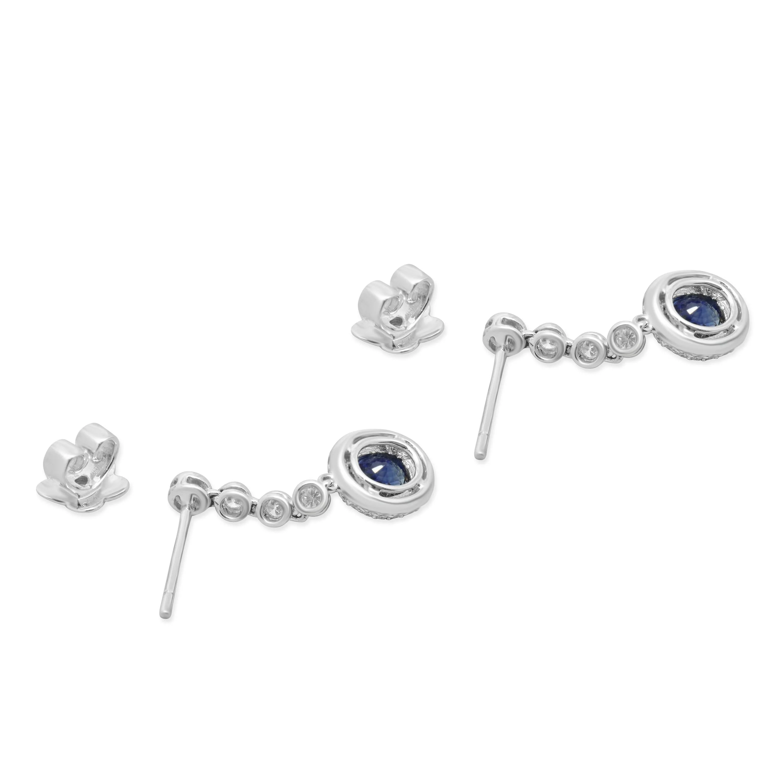 Elevate your elegance with these exquisite 18 Karat White Gold Sapphire and Diamond Drop Earrings. Featuring two captivating oval-cut sapphires, totaling 1.78 carats, each stone radiates a deep, mesmerizing blue set in a halo of 108 dazzling round brilliant-cut diamonds, with a total weight of 0.73 carats. The diamonds, graded H in color and SI1 in clarity, enhance the sapphires' beauty while adding their own brilliant sparkle. Crafted with precision, these earrings embody luxury, weighing 4.65 grams, they seamlessly balance luxury and sophistication. Perfect for making a refined statement, these earrings are a testament to superb craftsmanship and timeless elegance.