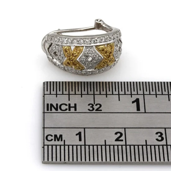 Elevate your jewelry collection with these exquisite 18K two-tone XO earrings, where artistry meets luxury in a stunning blend of white and yellow diamonds. These micro pave earrings feature a dazzling arrangement of 108 white diamonds and 36 yellow diamonds, totaling 1.21 carats, elegantly set in a harmonious curve that reflects light from every angle. Crafted in premium 18K white and yellow gold, each earring measures 21.0mm by 11.54mm and boasts a luxurious weight of 10.2 grams. The intricate design is secured with comfortable and secure omega backs, ensuring both style and functionality. Perfectly balancing boldness and sophistication, these earrings are a timeless addition to any wardrobe.
