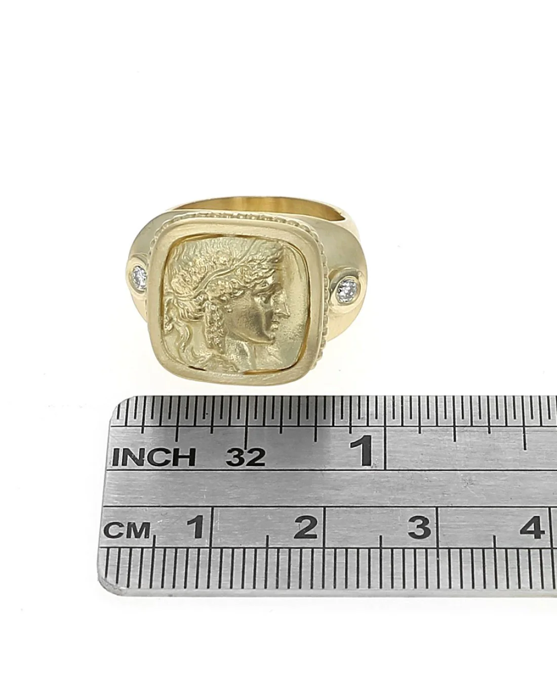 Crafted in luxurious 18K satin finish yellow gold, the Athena Diamond Accent Ring is a masterpiece that reflects opulence and refinement. Its centerpiece showcases an intricately detailed Athena motif, emulating timeless elegance and classical beauty. The tapered shank harmonizes with the bezel-set diamonds on either side, totaling 0.10 ctw, with an SI1-SI2 clarity and a color range of I-J, adding a touch of sparkle and sophistication. With dimensions of 16.6mm x 17.3mm x 8.8mm for the head, and a shank width tapering from 5.8mm to 8.3mm, this ring balances bold design with comfortable wear, weighing a solid 17.4 grams. Perfectly embodying the fusion of artistry and luxury, this ring is a statement of timeless elegance.