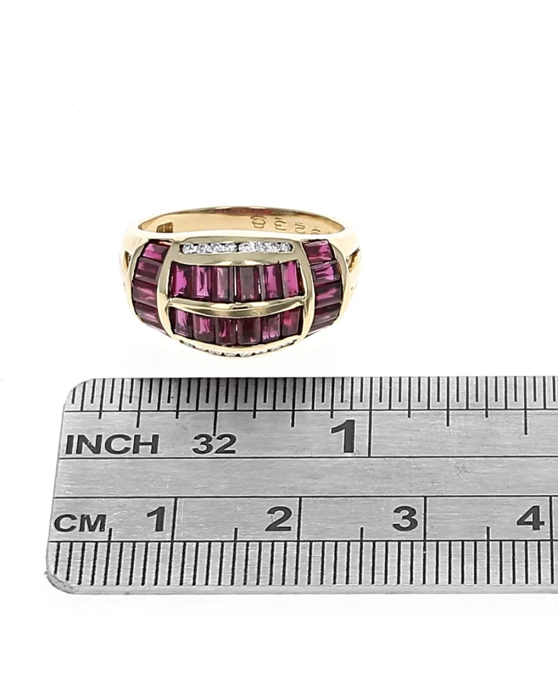Exuding elegance and sophistication, this enchanting tapered ring is meticulously crafted in 18K high-polish yellow gold. Its bold design features an open shank adorned with twenty-two exquisite channel-set baguette rubies totaling 2.64 carats, offering a vibrant splash of color. Complementing the rubies, sixteen channel-set round diamonds with a total weight of 0.13 carats, graded SI1-SI3, I color, add a scintillating sparkle to the piece. The ring's dimensions, 11.2mm x 4.9mm x 2.5mm, and total weight of 6.1 grams reflect the substantial craftsmanship. With a ring size of 6.75, this piece seamlessly blends artistry and luxury, making it a stunning addition to any collection.