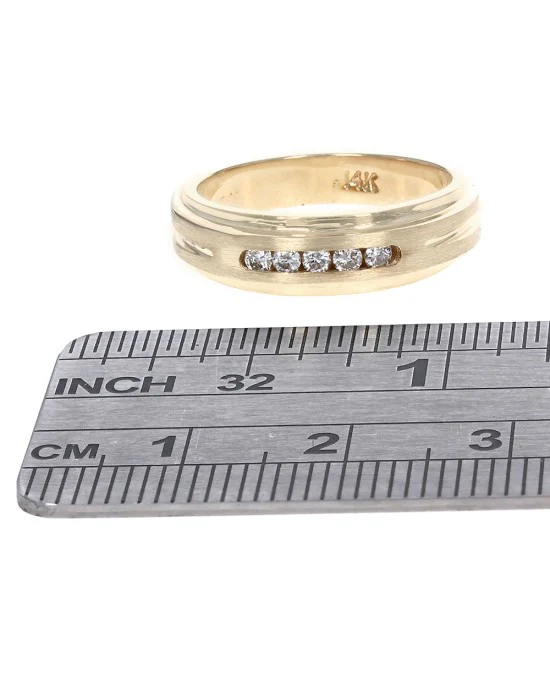 Elevate your elegance with this exquisitely crafted channel set diamond band, featuring a harmonious blend of timeless design and modern sophistication. Meticulously fashioned in radiant 14K yellow gold, this band showcases five brilliant round diamonds, collectively weighing 0.10 carats. Expertly set, these diamonds exhibit a captivating sparkle with a clarity of I1 and a subtle color range of I-J, reflecting their unmistakable quality and charm. The ring's sleek dimensions of 5.6mm in width and 2.1mm in height, paired with a weight of 5.1 grams, ensure a comfortable yet impactful presence on the finger. Finished with both high polish and brushed textures, this piece embodies impeccable craftsmanship and refined beauty, making it the perfect symbol of enduring love and elegance.