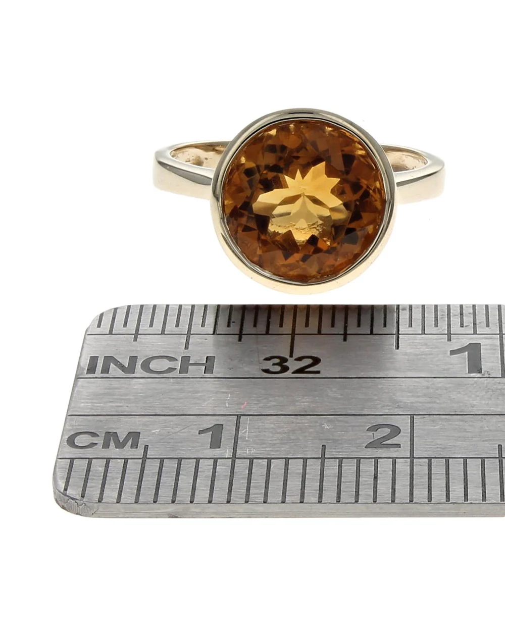 Crafted from high-quality yellow gold, this ring offers a luxurious gleam, perfectly complementing the vivid sparkle of the citrine. Designed for the discerning eye, its minimalist band ensures everyday wearability without compromising on style. Measuring approximately a half-inch in diameter, this piece combines exquisite craftsmanship with an enduring elegance, making it a perfect choice for any occasion.