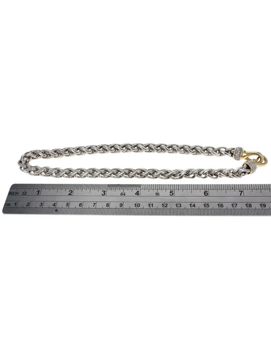 Exuding elegance and sophistication, the David Yurman "Classic Wheat" chain necklace seamlessly blends timeless design with luxurious materials. Crafted in highly polished sterling silver and accented with 18K yellow gold, this exquisite piece showcases a striking interplay of metals. The necklace features sixty-four bead-set, round brilliant cut diamonds totaling 0.64 carats, with an H-I color range and SI clarity, offering a captivating sparkle. Measuring 16 inches in length and 8.0 mm in width, the necklace ensures a comfortable yet secure fit with its lobster clasp closure. With a total weight of 93.5 grams, it reflects unparalleled craftsmanship and quality, making it a standout addition to any jewelry collection.