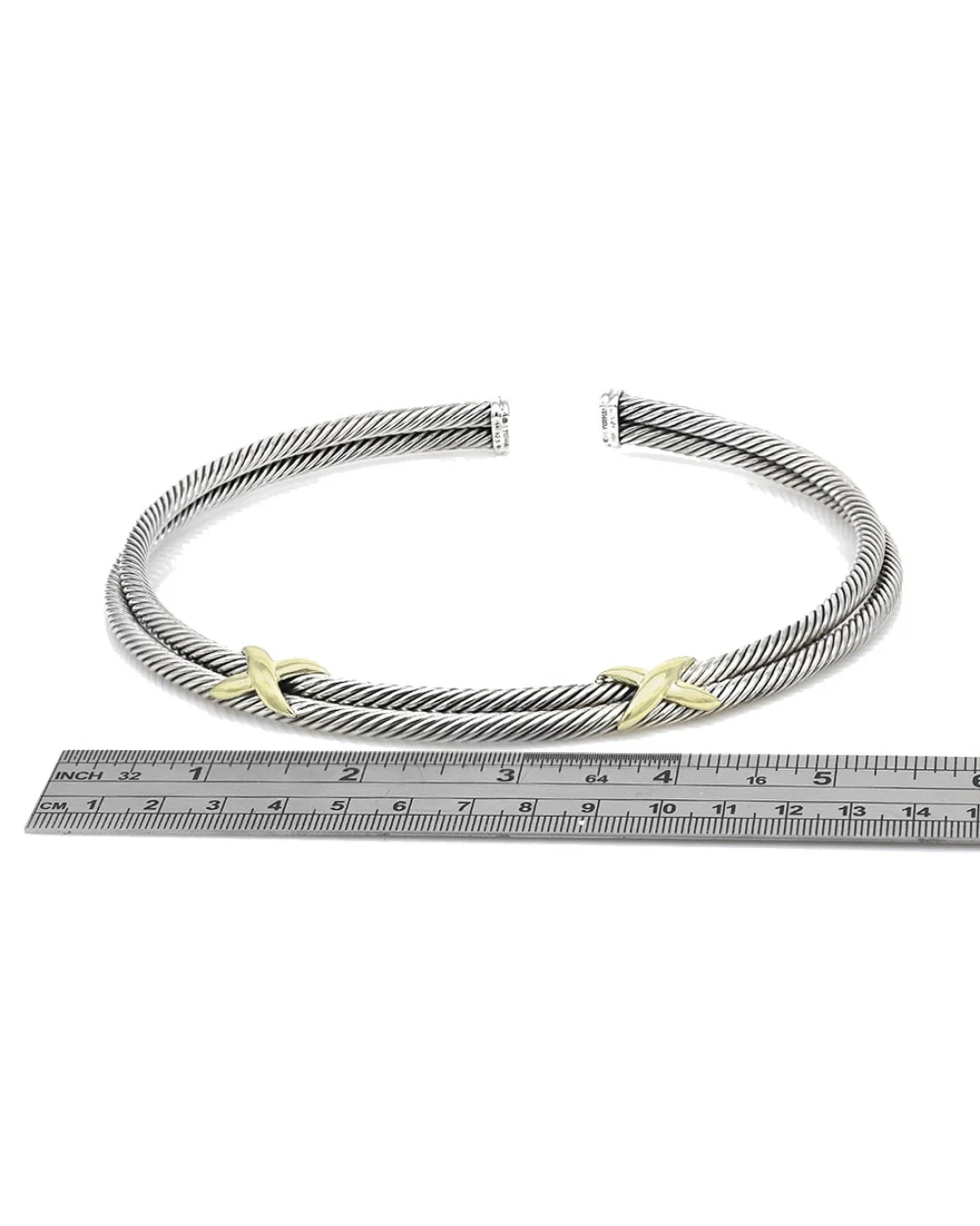 Experience the exquisite craftsmanship of the David Yurman Metro Double X Crossover Choker. This stunning piece artfully combines the sleek elegance of sterling silver with the luxurious warmth of 14K yellow gold. Its signature double X crossover design adds a touch of sophistication, while the flexible structure ensures a comfortable fit around the neck. With an inner circumference of 15.5 inches and a substantial width of 10.2mm, this choker offers both presence and subtlety. Weighing 98.9 grams, it exemplifies durability and craftsmanship with the D. Yurman hallmark signifying quality. This choker is an impeccable blend of style and elegance, crafted to enhance any sophisticated ensemble.
