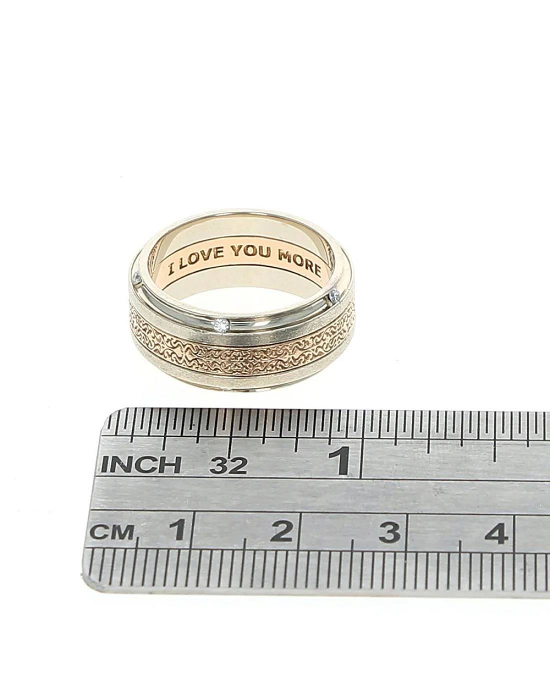 Presenting the Gentleman’s Addison Taylor 2 Tone Diamond Step Side Band, a sophisticated blend of artistry and elegance. This men’s wedding band features an eye-catching two-tone design crafted from polished metals, showcasing an intricate pattern of gold set against a distinguished silver hue. The band is adorned with carefully placed diamonds, each precisely cut to enhance the piece’s luxurious appeal, while the contrasting textures add depth and dimension. Measuring approximately 8mm in width, this ring balances substantial presence with refined detail. Inside the band, a heartfelt engraving adds a personal touch, making this a truly unique symbol of commitment.