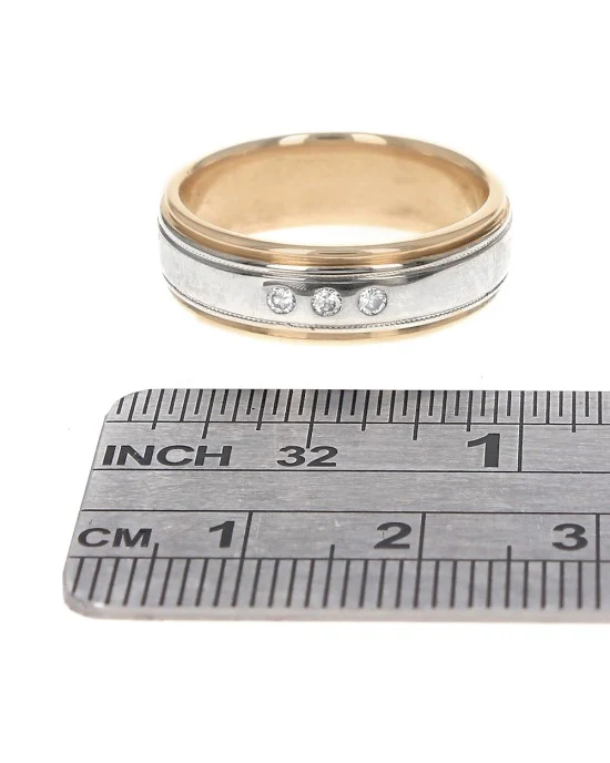 Introducing the distinguished Gentleman's Flush Set Diamond Band, a masterful blend of elegance and sophistication. Crafted in lustrous 14K high polish yellow and white gold, this exquisite ring features a sleek milgrain accent that adds a touch of classic refinement to its modern design. Adorned with three expertly flush-set round diamonds, totaling 0.02 carats, each gem is meticulously chosen for its I1 clarity and an I color rating, ensuring a subtle yet captivating sparkle. The ring's substantial weight of 9.3 grams provides a reassuring presence on the finger, further enhanced by its comfortable design at a size 9.75. This piece embodies a perfect harmony of craftsmanship and style, making it the ultimate symbol of enduring commitment.