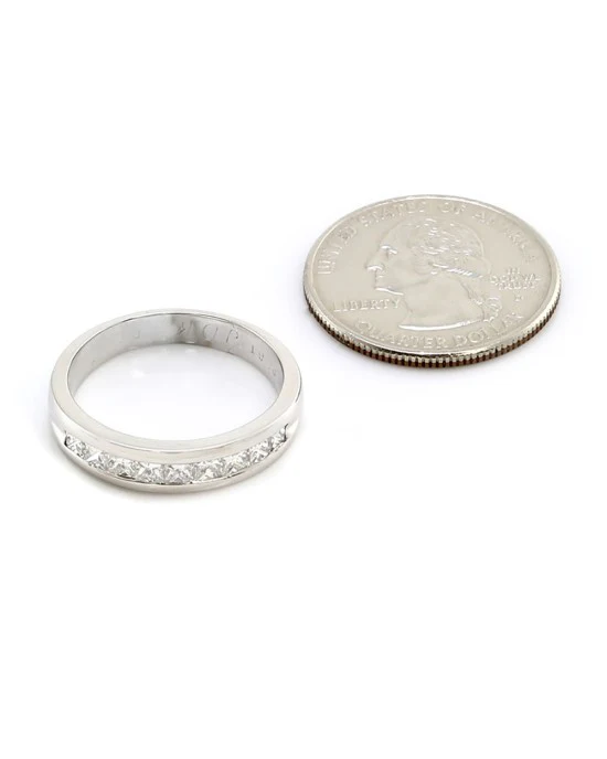 Crafted in luxurious platinum, the Gentleman's Single Row Princess Diamond Band epitomizes timeless elegance and refined sophistication. This distinguished men’s wedding band features a stunning array of nine channel-set princess-cut diamonds, totaling 1.35 carats. The diamonds, with an SI3 clarity and H color, are precisely arranged to create a seamless row of radiance that adds a touch of brilliance to any occasion. The band measures a sleek 5.1mm in width, balanced with dimensions of 2.2mm by 3.6mm, offering a perfect combination of comfort and style. Weighing 8.9 grams, its substantial presence underscores quality craftsmanship, highlighting the hallmark of exclusive platinum. Ideal for the discerning gentleman, this ring is more than a symbol of commitment; it is a statement of enduring luxury and sophistication.