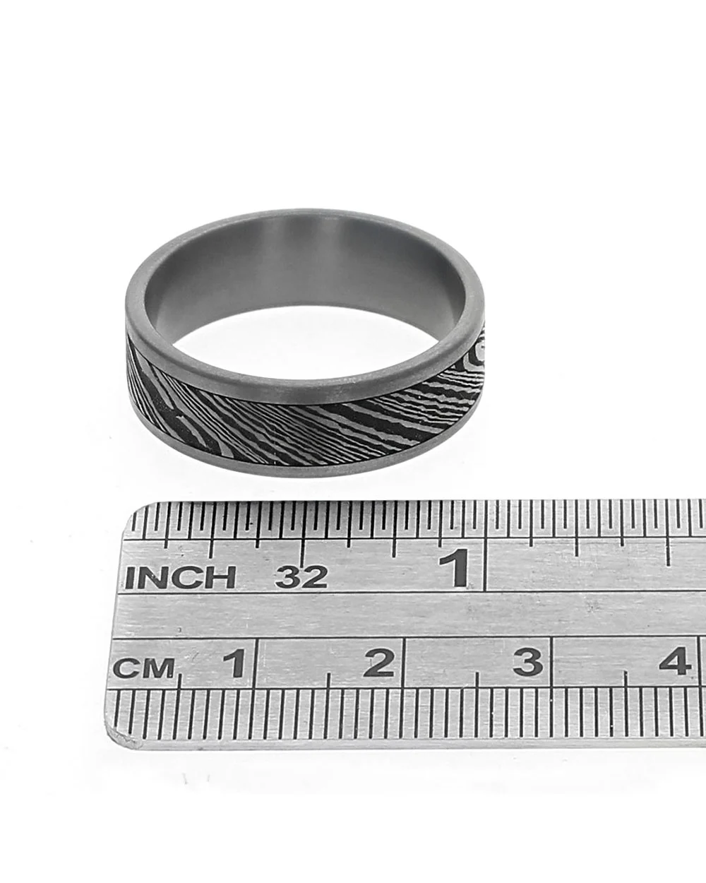 The intricate Damascus pattern, a hallmark of craftsmanship, reflects an exquisite interplay of light and texture, evoking the artisanal skill inherent in its creation. The band measures an ideal width for a solid, stylish statement without being overstated. Marrying form and function, this ring is perfect for the discerning individual who values both elegance and resilience in their jewelry.