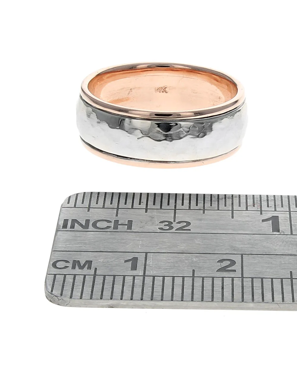 The Hammered, Grooved Band Ring is an elegant fusion of texture and design, crafted to capture both tradition and contemporary style. This exquisite piece, ideal for a woman's wedding band or a sophisticated statement ring, features a striking hammered texture that reflects light beautifully, creating a shimmering effect that catches every eye. Encased in a subtle groove, the band measures approximately 6mm in width, showcasing a perfect balance of solidity and grace. With its 14K rose gold inner and outer rims subtly contrasting against the sleek, polished central band, this ring is crafted with meticulous precision. Its durable craftsmanship ensures it will remain a cherished piece for years to come. Whether celebrating a lifelong commitment or personal style, this ring stands out with its beautiful blend of artistry and quality.
