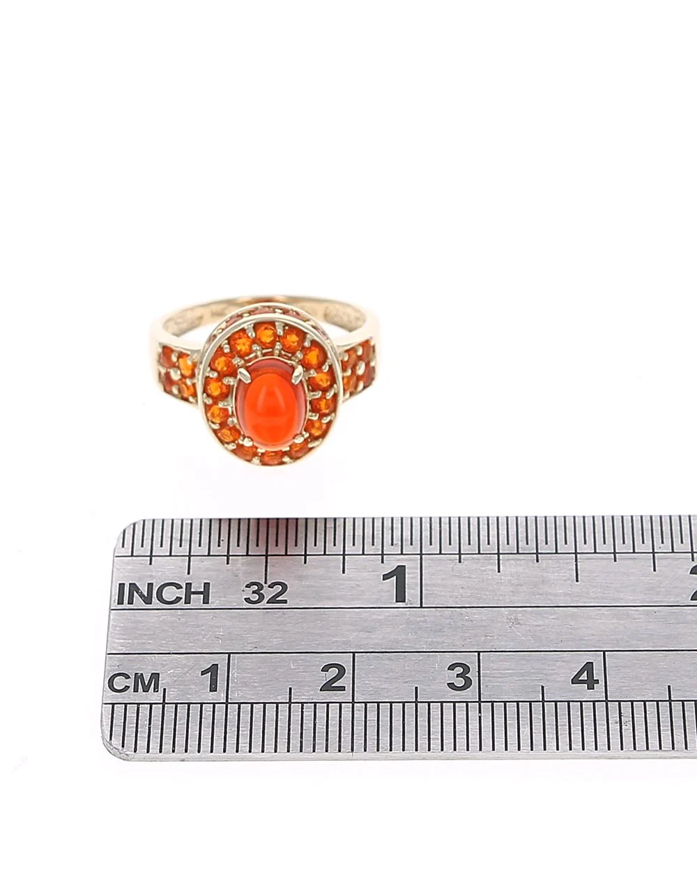 Illuminate your style with the Mexican Fire Opal Halo Ring, masterfully crafted in luxurious yellow gold. At its heart, a vibrant Mexican fire opal radiates warmth, encircled by a dazzling halo of smaller, fiery opals, creating an eye-catching symphony of colors. The ring's splendid design is further elevated by additional opal accents along the band, ensuring a continuous play of light and color. Expertly fashioned to capture both elegance and durability, this piece exemplifies superior craftsmanship. Embrace the allure of exquisite gemstones and detailed artistry with this magnificent statement ring.