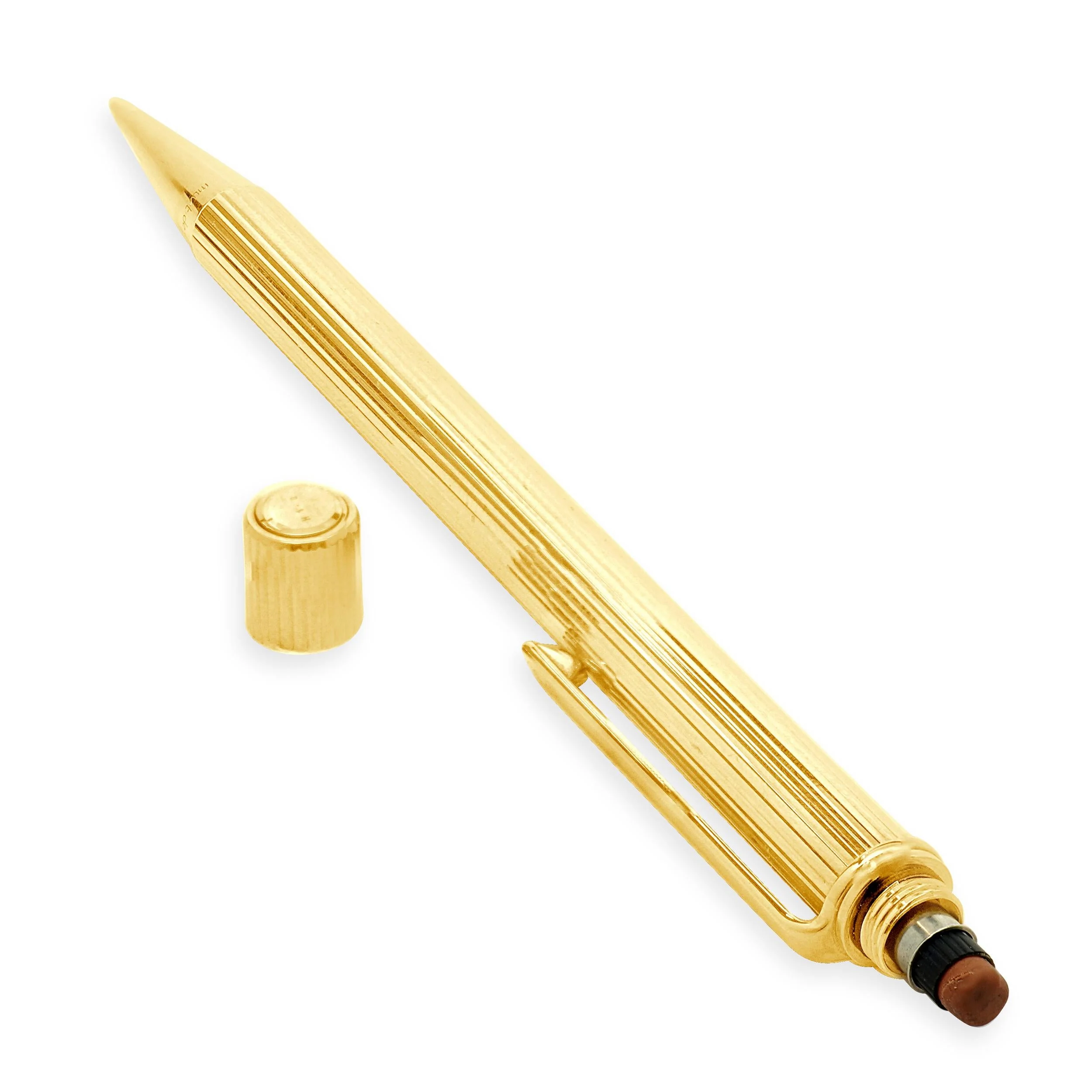 Experience the epitome of luxury writing with the Must de Cartier Gold Plated Pencil, a masterpiece that seamlessly blends elegance with functionality. Showcasing a resplendent yellow-gold finish over a robust steel body, this pencil exudes sophistication and durability. The minimalist design enhances its sleek contour, letting the gleam of the gold plating take center stage. Each clean, contemporary line speaks to Cartier’s esteemed design pedigree, underscored by the iconic signature etched onto its surface. Although not accompanied by box or papers, this exquisite piece still offers a refined tactile surface, making it not just a writing instrument but a collectible work of art.