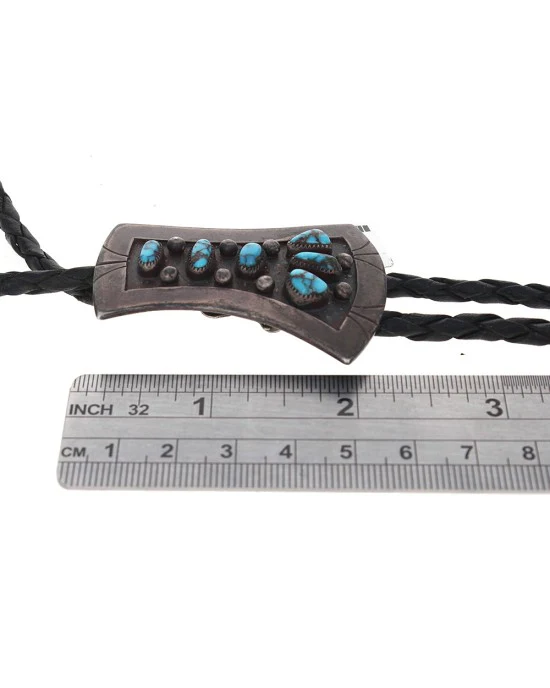 Elevate your style with the exquisite Navajo Sterling Silver & Turquoise Bolo Tie, a true testament to fine craftsmanship and timeless design. This striking piece features a beautifully crafted sterling silver pendant, measuring 2-3/16 inches long and 1-13/16 inches wide, adorned with vibrant turquoise gemstones that add a touch of color and elegance. The bolo tie extends to a generous 40 inches, allowing versatile styling, while the intricately detailed sterling silver tips, measuring 2-1/4 inches long and 1/4 inch wide, enhance the overall sophistication. Weighing 42.3 grams, this piece combines traditional Navajo artistry with lasting durability, making it an exceptional accessory for any discerning collector.