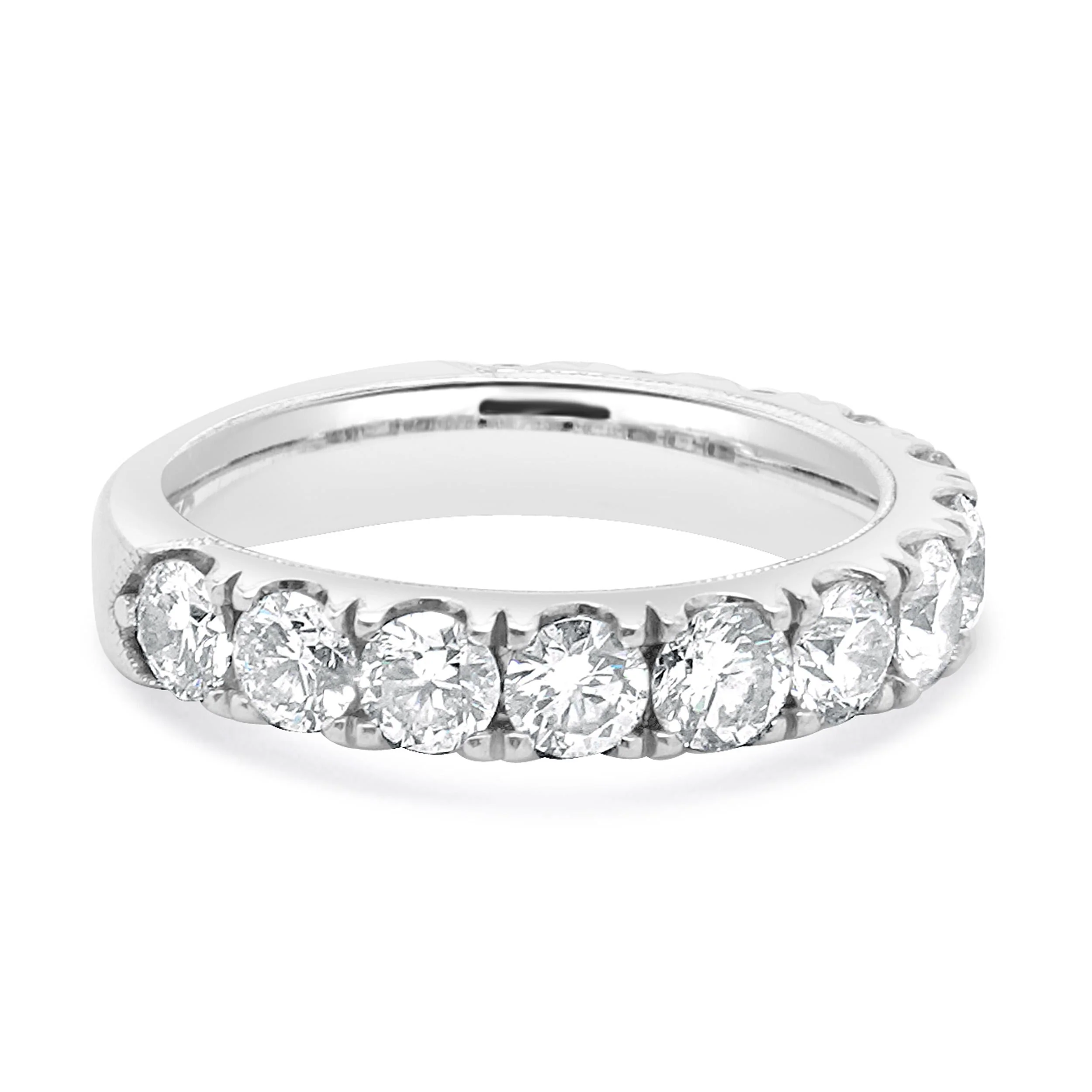 Indulge in timeless elegance with the Neil Lane 14 Karat White Gold Diamond Semi Eternity Band. Crafted from exquisite 14k white gold, this stunning wedding band features thirteen round cut diamonds totaling 2.00 carats, exuding a radiant sparkle that captures the light and attention. Each diamond, with a clarity grade of SI2 and a color rating of I, showcases exceptional brilliance, meticulously set to complement the sleek, polished finish of the band. Weighing 4.4 grams and available in a ring size 6, this band can be adjusted to your perfect fit. Embrace the artistry and sophistication of fine jewelry with a piece that elegantly signifies your most cherished moments.