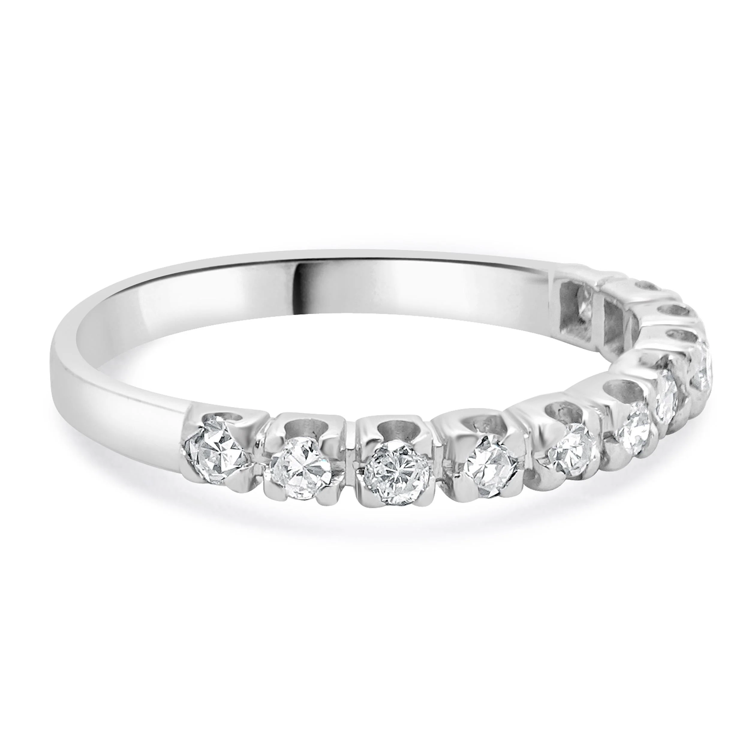 Experience timeless elegance with this Platinum Diamond Band, a masterpiece of durability and brilliance. Crafted from solid platinum, this wedding band showcases a streamlined design adorned with 11 round-cut diamonds totaling 0.22 carats. Each diamond, with its I3 clarity and I, J color, is meticulously set to reflect consistent sparkle across the finger, creating a captivating display of light. The ring's high-density structure ensures exceptional wear resistance, making it an ideal symbol of enduring love. Sized at 6.5 and adjustable, this 1.72-gram band offers a refined, modern aesthetic—perfect alone or when paired seamlessly with an engagement ring.