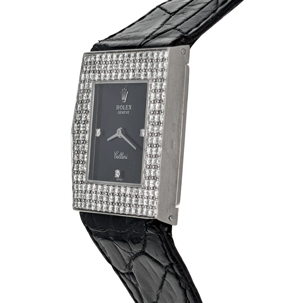 An extraordinary expression of vintage glamour and bold design, the Rolex Cellini Midas Ref. 4031 embodies the artistry and exclusivity of Rolex’s most avant-garde collection. Crafted in 18K white gold, the distinctive 28mm case is crowned with a breathtaking pave diamond-set top, radiating brilliance from every angle. The refined black dial is accented with diamond-set index hour markers, creating a striking contrast of light and depth that enhances its dramatic presence. Powered by a precise Swiss manual-wind movement, the watch offers classic hours and minutes functionality, protected beneath a scratch-resistant sapphire crystal. It is paired with a sophisticated black leather strap secured by a gold-plated pin buckle, and finished with a solid 18K white gold case back.