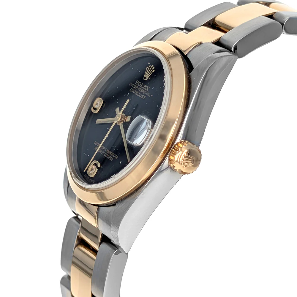 Elegant, distinctive, and effortlessly refined, the Rolex Datejust offers a sophisticated interpretation of one of the world’s most iconic timepieces. This beautifully proportioned model features a 31mm stainless steel case accented by a fixed 18K yellow gold smooth bezel, creating a harmonious two-tone aesthetic. The striking onyx dial provides a dramatic, high-gloss backdrop, highlighted by diamond-set 6 and 9 Arabic numerals that add brilliance and individuality to the design. Powered by a precision Swiss automatic movement, it delivers hours, minutes, seconds, and date functionality, blending practicality with timeless luxury. A scratch-resistant sapphire crystal protects the dial, while the stainless steel and 18K yellow gold Oyster bracelet with folding clasp ensures both comfort and security. The watch is completed with a solid stainless steel case back.