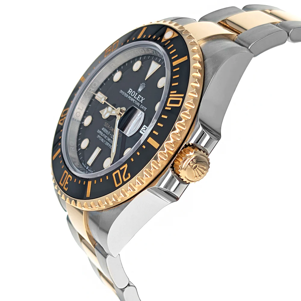 Discover the bold sophistication of the Rolex Sea-Dweller Ref. 126603, a striking 43mm dive watch crafted in stainless steel and 18K yellow gold. Designed for professional performance, it features a helium escape valve, an unidirectional gold bezel with black ceramic insert, and an intense black dial with luminous markers for exceptional legibility. Powered by a Swiss automatic movement with hours, minutes, seconds, and date, and protected by a sapphire crystal, this timepiece is completed by a two-tone Oyster bracelet with folding clasp and a solid stainless steel case back. Offered in pre-owned condition, certified by ED Marshall Jewelers (not affiliated with Rolex USA), and accompanied by its original box and papers.