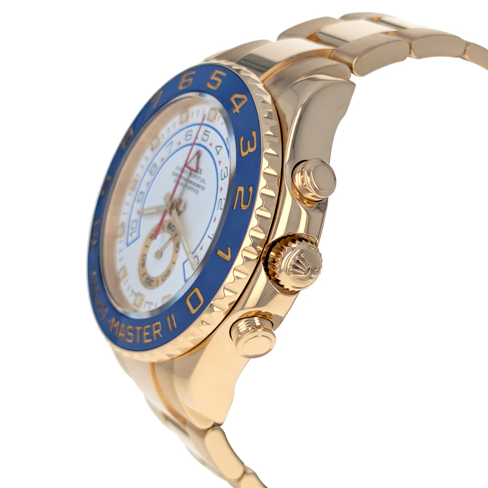 The Rolex Yacht-Master II, Reference 116688, is a bold and highly specialized timepiece crafted for precision and presence. Its commanding 44mm 18K yellow gold case is paired with Rolex’s signature Ring Command unidirectional rotating bezel in 18K yellow gold, accented by a striking blue ceramic insert. The crisp white dial features luminous hour markers and Arabic numerals, ensuring exceptional legibility.