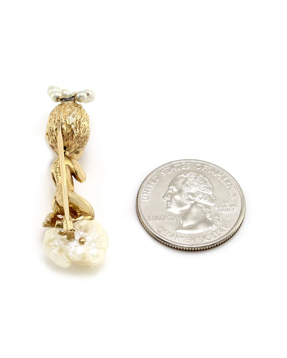 Embrace elegance and whimsy with the Ruser Freshwater Pearl and Sapphire Cherub on Cloud Pin. This exquisite piece is crafted in high polish 14K yellow gold, featuring a charming cherub perched on a delicate cloud. The artistry is enhanced by two meticulously bead-set round blue sapphires, totaling 0.02 carats, alongside eleven luminous round pearls measuring 2.5mm each. At the base, a striking baroque pearl measuring 14.0mm x 11.0mm x 9.0mm adds a unique and organic touch. Measuring 46.0mm x 14.0mm x 13.0mm and finished with a secure locking C-clasp, this pin is a testament to exquisite craftsmanship and timeless design, weighing a substantial 13.7g. Hallmarked ©RUSER 14K, this piece beautifully captures sophistication and charm, making it a standout addition to any collection.