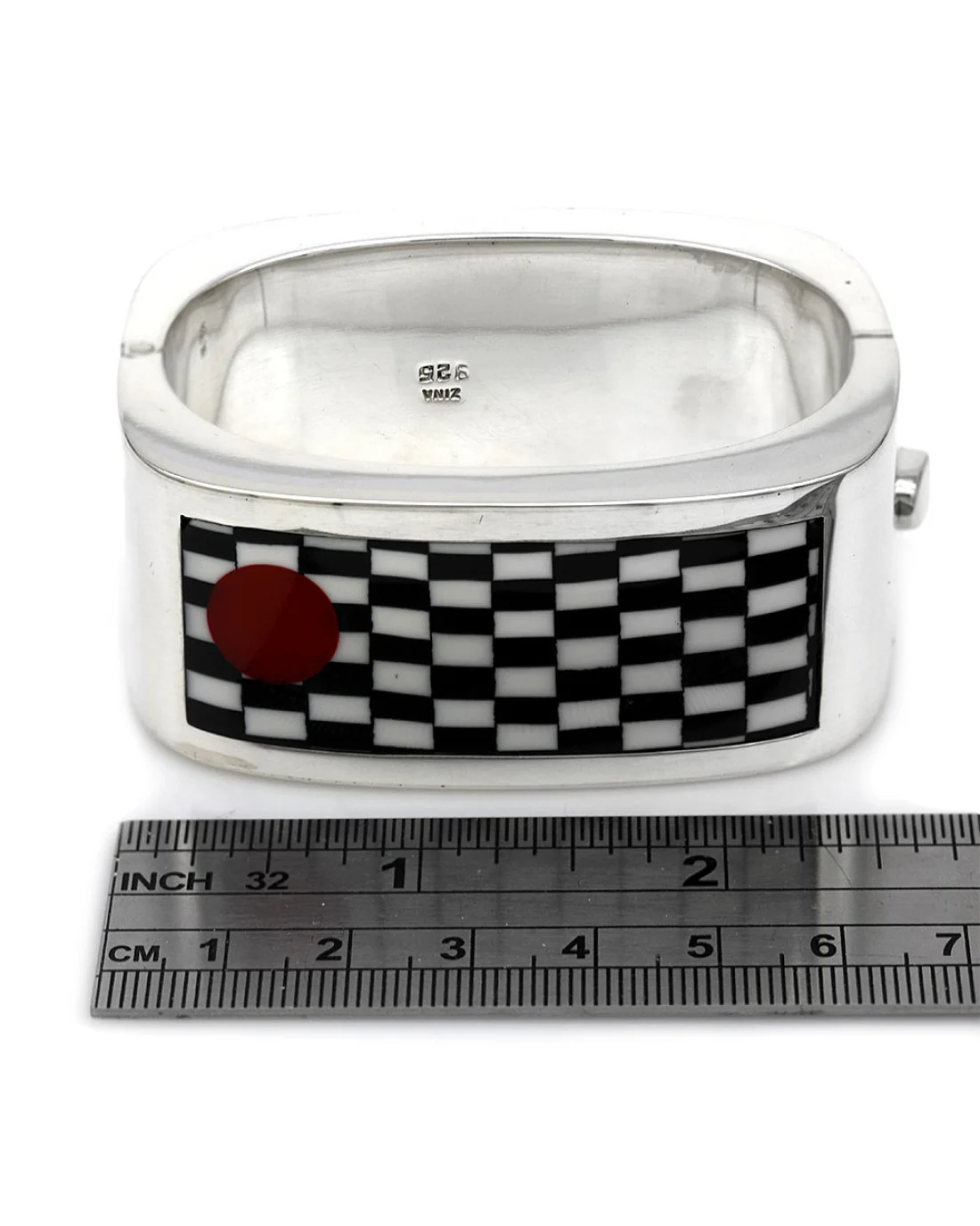 Introducing the Zina Black & White Checkerboard Wide Bangle in Silver, a masterful convergence of artistry and precision engineering. This striking piece, meticulously crafted from sterling silver, showcases a bold checkerboard pattern contrasted by a distinctive red accent, embodying contemporary elegance. With a sturdy weight of 96 grams, this bangle offers substantial presence while maintaining comfort at a length of 6.5 inches. The hallmark "Zina 925" assures you of its authenticity and superior craftsmanship, while the secure push button clasp ensures ease of wear. Elevate your ensemble with this exceptional unisex bracelet, where sleek design meets timeless sophistication.